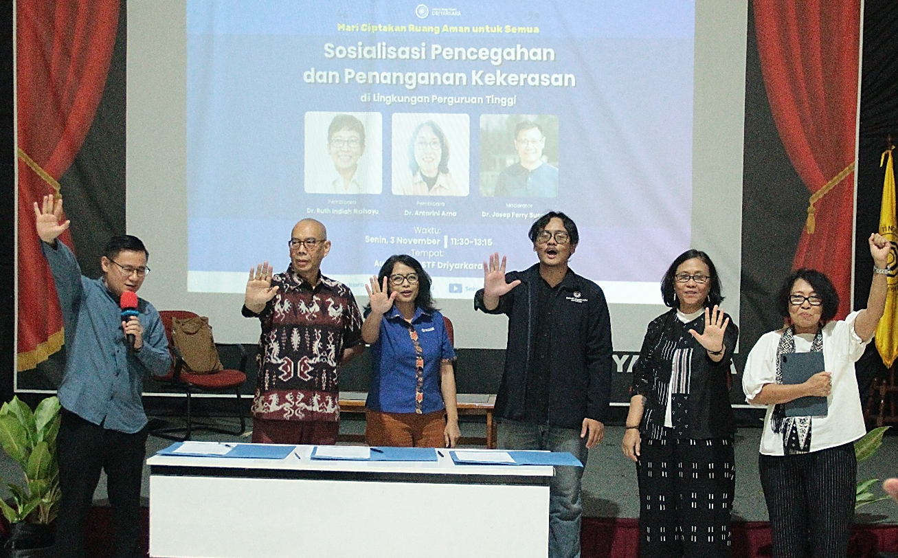 Untuk membangun komitmen bersama dalam menciptakan ruang aman bagi seluruh civitas academika Sekolah Tinggi Filsafat Driyarkara pada Senin, 3 November 2023, Pk. 1130 – 13.15 bertempat di Auditorium STF Driyarkara menyelenggarakan kegiatan Sosialisasi Pencegahan dan Penanganan Kekerasan di Lingkungan Perguruan Tinggi. Narasumber acara ini adalah Dr. Ruth Indiah Rahayu (Aktivis pejuang pembela kaum perempuan; Alumni STFD), Dr. Antarini Arna (Aktivis pejuang pembela kaum perempuan; Alumni STFD), dan moderator Dr. Ferry Susanto (Ketua Satgas PPKPT STF Driyarkara).